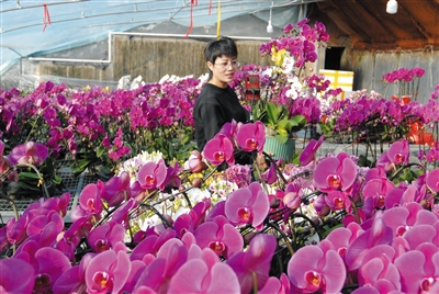 1月10日,青岛市即墨区大信镇任家屯村的花农在直播带货,通过网络平台销售蝴蝶兰。