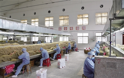 1月10日,会昌县五丰食品有限公司的工作人员在车间包装米粉(1月10日摄)。