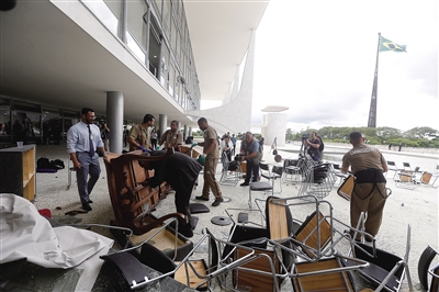 据美联社报道,超过100辆搭载示威者的大巴8日抵达巴西首都巴西利亚。数千名博索纳罗的支持者当天闯入国会大厦、联邦最高法院和总统府,与军警冲突。这些人打砸破坏,导致总统府窗户破损、办公用品四散,国会大厦部分区域淹水,最高法院多个会议厅遭洗劫。