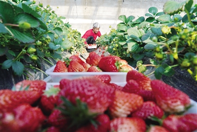 2月1日,秦皇岛市抚宁区榆关镇农民在大棚内采摘草莓。