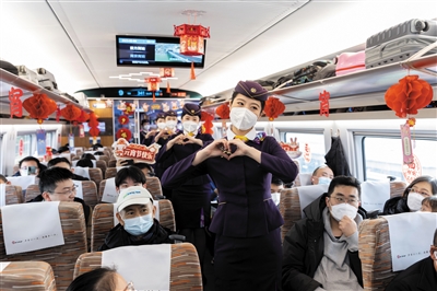 2月4日,铁路上海客运段乘务人员在G8次列车上为旅客表演节目。
