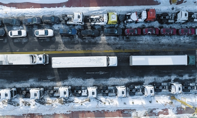 来自哈萨克斯坦的货车、即将出口的车辆在巴克图口岸排队等候出境(2月4日摄,无人机照片)。