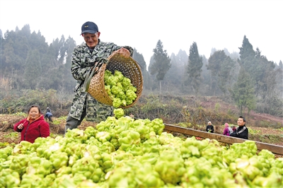 2月10日,南充市嘉陵区安福镇垭子口村的村民在收获青菜头。