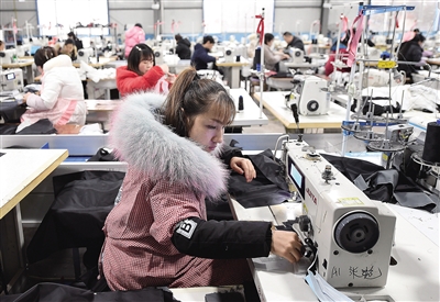 2月13日,在宣恩县高罗镇歌乐城社区一服装加工厂,工人忙碌在生产线上。