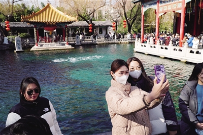 2月14日,山东省济南市天下第一泉风景区,游客在趵突泉游览。