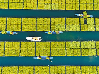 2月17日,浙江省杭州市淳安县千岛湖镇坪山生态浮岛上,工作人员忙着采摘水生蔬菜(无人机照片)。