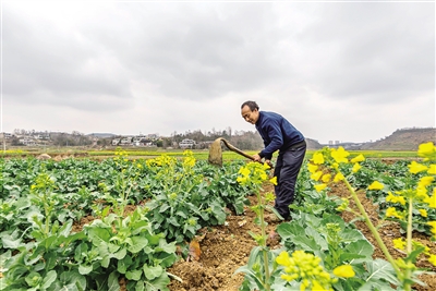 2月19日,村民在贵州省黔西市锦绣街道新民社区的油菜地里套种玉米。