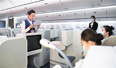 2月20日,参赛乘务员在中国南航广州产教融合实训基地的客舱模拟器中参加中英文口播服务实操考核。