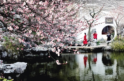 2月19日,游客在江苏苏州古典园林艺圃内赏梅拍照。