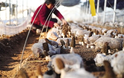 近日,在山东省成武县,羊肚菌陆续达到成熟收获标准。当地根据市场需求,发展羊肚菌产业,带动村民就业增收。 新华社记者 徐速绘摄