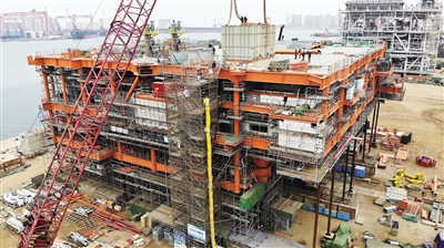 这是正在建造中的渤中19-6凝析气田一期CEPA(中心处理平台)组块(2月22日,无人机照片)。