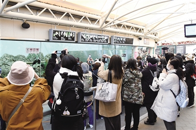 2月21日,在日本和歌山县白浜町的“冒险世界”乐园,游客们观看大熊猫“永明”。