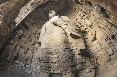 北壁中央立佛像高约15.5米,身披千佛袈裟,气宇轩昂。主尊立佛像,头顶穹庐,脚踏莲台,高大雄伟。左手握“法衣”屈肘抚胸,指间有“蹼”,右下臂断折失却。佛像身披袒右肩袈裟,质感强烈,偶有彩绘痕迹。