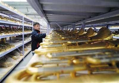 河北省武强县一家西洋乐器生产企业的员工在清点乐器半成品数量(2月23日摄)。