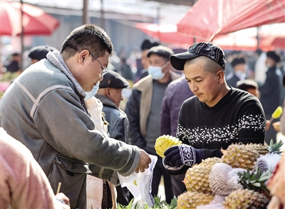 2月26日,在托克扎克镇农贸市场,顾客在购买菠萝。春意渐浓,新疆各地的乡镇巴扎(维吾尔语,意为“集市”)也愈加热闹。每逢周日,新疆喀什地区疏附县托克扎克镇农贸市场都会迎来“巴扎日”,各族群众在巴扎上品尝美食、选购物品,享受着春日暖阳。 新华社记者 马锴摄