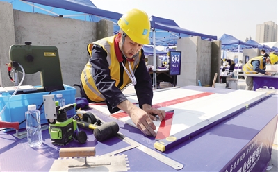 3月6日,参赛选手在进行装饰装修工(镶贴工)项目比赛。