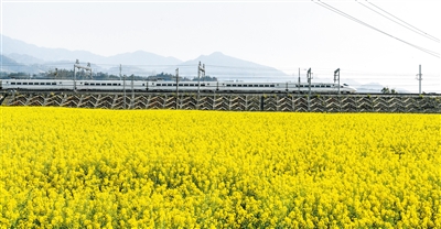 3月9日,一列动车组列车从贵广高铁贵州榕江段的油菜花田旁驶过。时下,在贵州省黔东南苗族侗族自治州,油菜花陆续盛开,动车组列车穿行其间,美不胜收。