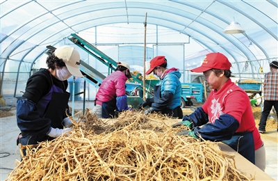 为了解决村里黄花晾晒暖棚、场地闲置问题,云州区许堡乡西册田村党支部主动联系市场找项目、找资金,承揽了黄芪粗加工业务,让村民农闲时在家门口就能挣到钱。今年,预计加工黄芪500吨,带动本村及附近村民务工收入130多万元。图为昨日村民们正在分拣黄芪。 本报记者 张占兵摄