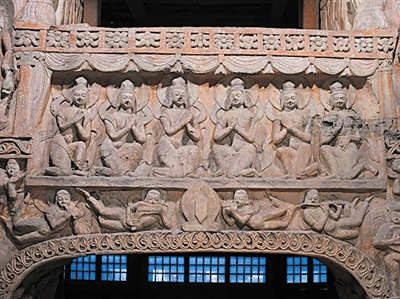 在“六美人”的画面两边均雕刻了类似于犍陀罗希腊式科林斯浮雕柱的立柱,虽然这些立柱并未塑造为立体感很强的滚圆形状,同时雕刻规模也缩小了,但不雕刻任何内容的素面柱体及其对画面的装饰作用,已经足以显示其犍陀罗艺术风格的特性了。