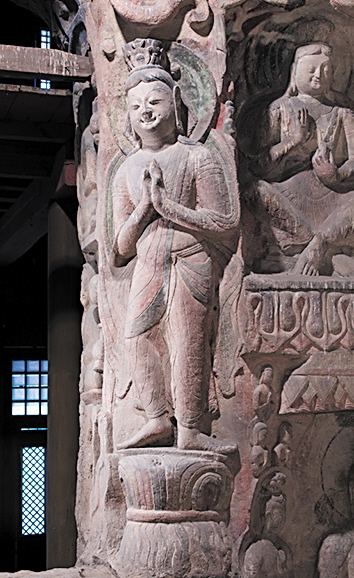特别难得一见的是位于明窗西侧内角的露齿酒窝供养菩萨形象,高约两米,戴“半月”花冠,长发由耳后披至两肩,素面圆形头光,身著紧身长裙,斜披络腋,双臂挎飘带。菩萨双手合十,头略略倾向右前方,左腿直、脚踏实,右腿略弯、脚前掌着地,赤脚立束帛座上,形态自然轻松、雍容华贵。面部表情呈现为露齿一笑,两嘴角微微上翘,露出六颗洁白的牙齿,两颊一对酒窝,是云冈石窟唯一露齿酒窝微笑菩萨。网友亲切地称其为“萌菩萨”。
