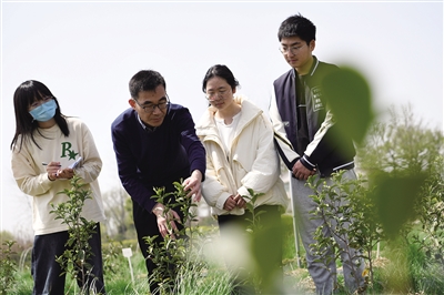 3月26日,在皖中综合试验站内,安徽农业大学茶树生物学与资源利用国家重点实验室常务副主任韦朝领(左二)在给学生讲解茶树新品种选育的相关知识。