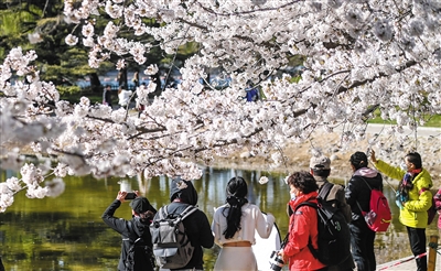 3月27日,游人在玉渊潭公园赏樱。