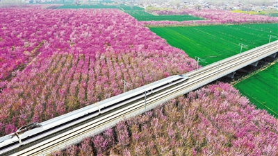 3月27日,高铁列车从许昌市建安区小召乡紫荆花海中驶过(无人机照片)。