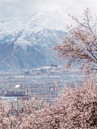 帕邦喀周围盛开的桃花和远处的布达拉宫(3月30日摄)。