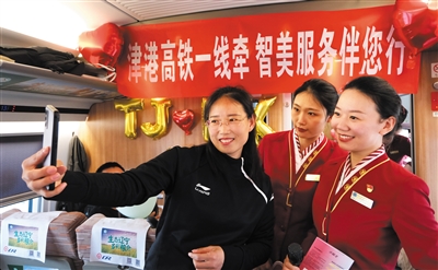 4月1日,在天津西至香港西九龙G305次列车上,旅客与乘务人员拍照留念。
