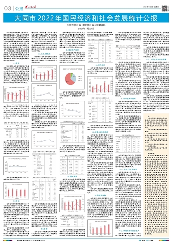 2022年是大同发展史上极不平凡、挑战严峻的一年。全市上下在市委市政府的坚强领导下,全面落实以习近平同志为核心的党中央各项决策部署,认真学习贯彻党的二十大精神,牢牢把握“全方位推动高质量发展”要求,坚持稳中求进工作总基调,扎实苦干实干,推动中央大政方针和省委决策部署在大同全面正确有效落实,开展了一系列谋全局、打基础、利长远的重要工作,实施了一大批增动能、补短板、强弱项的重点项目,各项工作取得新进展,开创了新局面。全市经济稳步发展,生态环境稳中向好,民生福祉持续改善,社会大局和谐稳定,推动大同高质量发展新征程迈出坚实步伐。
