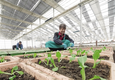 4月3日,工人在秦皇岛市抚宁区坟坨镇一处“农光互补”项目的智能光伏温室内栽植盆景白菜。