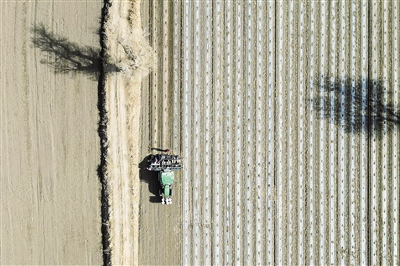 在新疆尉犁县,棉农进行春播作业(3月29日摄,无人机照片)。进入3月底4月初,天气渐暖,土壤墒情好,新疆棉花春播自南向北拉开序幕。在新疆麦盖提县、尉犁县等地,当地棉农借助卫星导航、农机等,机械化实施作业,全面开展棉花播种工作。