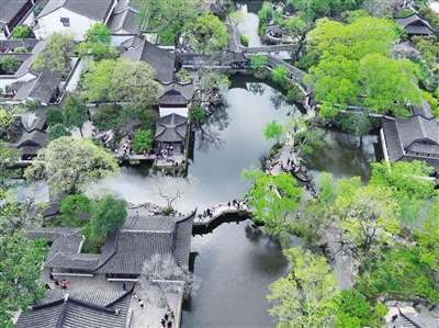 4月5日,游人在江苏苏州拙政园游览。