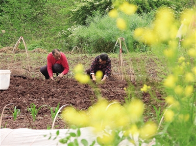 4月5日,村民在四川省达州市渠县合力镇双土社区移栽玉米秧苗。