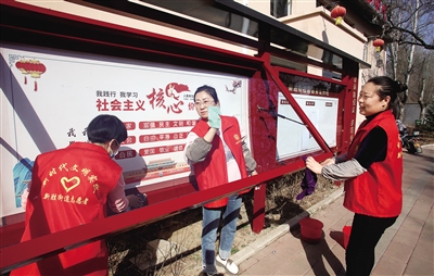 为进一步营造整洁、优美的卫生环境,助力文明城市创建,4月12日,云冈区新胜街道新胜街社区组织社区网格员和党员志愿者以及辖区单位志愿者在煤校家属院开展志愿服务活动,清除近几日沙尘天气带来的环境污染,以实际行动传播文明,传递志愿精神,带动更多的人参与到志愿服务中来。图为志愿者正在擦洗小区宣传栏。 本报记者 韩堃摄