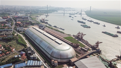 这是4月17日拍摄的湖南省岳阳市城陵矶港“胶囊”形散货大棚(无人机照片)。