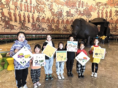 活动开始,讲解员带领大家参观博物馆大厅,详细介绍了一楼大厅的壁画以及牛拉鳖甲车雕塑,了解了北魏时期贵族出行乘坐牛车的时尚之风。同时,也让小朋友们了解了清明的由来、传统习俗。