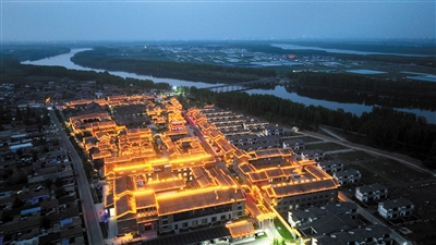 近年来,山东省临沂市持续加大旅游资源整合提升,擦亮“红色沂蒙 时尚临沂”品牌,推动“美丽环境、美丽经济、美丽生活”融合发展。图为4月25日拍摄的山东省临沂市临沭县曹庄镇朱村夜景(无人机照片)。 新华社发(马红坤摄)