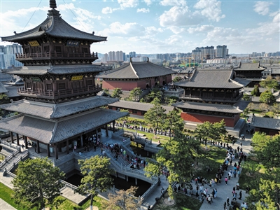昨日是“五一”假期第二天,我市各景区景点游人如织、热闹非凡,游客在观美景、品美食、赏民俗的同时,尽情感受古都大同浓厚的历史文化底蕴。图为华严寺景区众多游客有序参观游览。 本报记者 戎禹仁摄