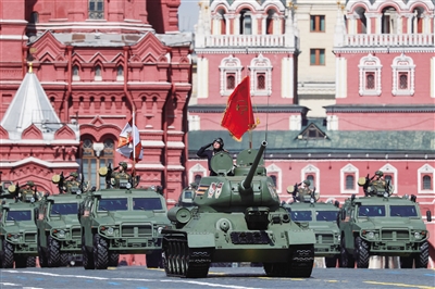 上图:5月9日,在俄罗斯首都莫斯科,T-34坦克(前)驶过红场。新华社发