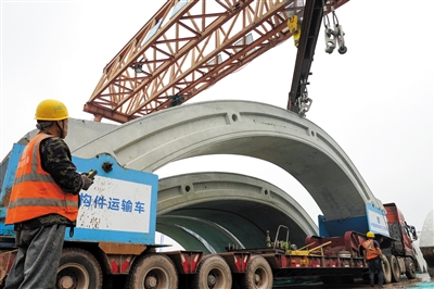 5月26日,在新森大道隧道工程的装配式预制构件货场内,工人在对装载预制构件的专用车辆进行安全检查。