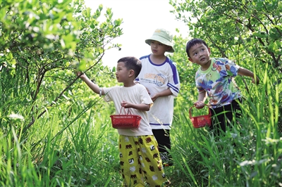 6月3日,小朋友在贵州省麻江县蓝梦谷生态蓝莓园采摘蓝莓。