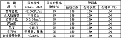 1. 15个采样点常规43项监测结果: 出厂水水质合格率100%;管网水水质合格率100%。
