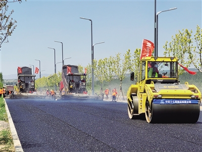 从6月14日上午开始,云州街东延最后3公里道路的面层沥青施工正式拉开帷幕。据了解,云州街东延(开发区纬一路)道路建设工程位于我市市区东北区域,全长11.15公里,是市区与火山地质公园之间一条非常重要、便捷的交通主干路。此次进行面层沥青铺设的是云州街东延东端终点至2号桥桥头路段,长约3公里,大约4天可完成全部施工任务。届时,云州街东延主路及非机动车道将完成全线沥青铺设,同时继续推进附属工程收尾施工,为6月底该道路全线通车奠定坚实基础。图为面层沥青铺设施工现场。 本报记者 戎禹仁摄