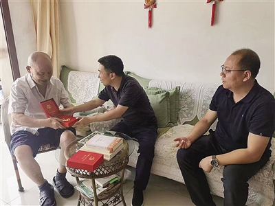 日前,市气象局有关负责同志到退休老党员家中慰问退休老党员,并送上工作三十年奖章。 杜美琳摄