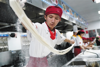 陕西省西安市蓝田县是著名的“厨师之乡”。为进一步发挥蓝田厨师资源优势,蓝田县通过成立陕西省首家公办三年制烹饪专业中等职业教育学校——蓝田厨师学校,培养具有较高文化素养、艺术素养的一专多能的新一代厨师,让具有地方特色的职业教育拓展就业渠道,助力乡村振兴。图为,6月25日,在位于西安市蓝田县的蓝田厨师学校中式面点实训室,学生在练习制作面条。