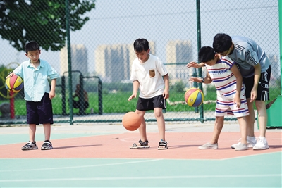 7月10日,在河北沧州,志愿者周义帛(右一)教建设大街社区的孩子打篮球。暑假期间,河北沧州孟村回族自治县30多名回乡大中专学生组成志愿服务队,走进乡村、社区,为留守儿童和有需要的青少年开展志愿服务,让孩子们度过一个多彩假期。 新华社记者 王民摄