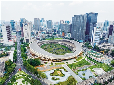 7月20日拍摄的成都东华门遗址公园外场遗址区(下)以及位于成都体育中心内的内场遗址区(无人机照片)。