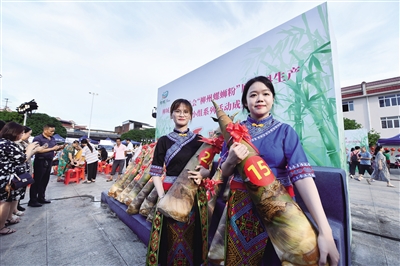 7月21日,在柳州市柳城县“笋王”争霸赛现场,工作人员展示参赛竹笋。