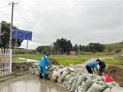 近日,我市出现今年入汛以来强降雨天气过程。为全力保障人民群众生命财产安全,云州区周士庄镇村两级干部和群众积极行动起来,制定应急预案,备足抗洪物资,精准扎实做好各项防汛准备工作。图为该镇干部群众在五十里铺村东沟地质灾害隐患点与村口之间垒筑防洪砂土坝。